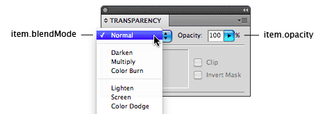 Visit the item.blendMode reference to see the different supported blend modes.