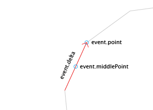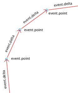 - event.delta is the vector of the mouse drag event; the distance and direction from the last mouse drag event
