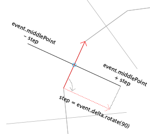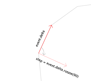 First we create a variable called step and reference event.delta (the vector of the mouse movement) in it. We rotate this vector by 90 degrees by adding 90 to the point.angle of step:
